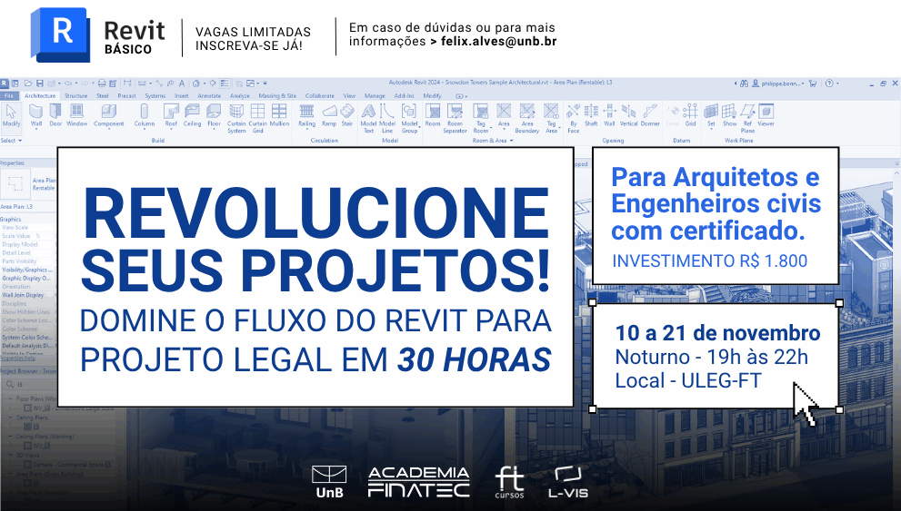Este curso tem como finalidade capacitar profissionais na utilização do Autodesk Revit, apresentando um fluxo de trabalho voltado à representação de edificações de pequeno porte em nível de projeto legal. O conteúdo contempla desde os fundamentos do BIM até a aplicação prática das principais ferramentas do Revit, incluindo modelagem de elementos arquitetônicos e estruturais, criação de vistas, tabelas, pranchas e exportação de documentos. A metodologia adotada prioriza a produtividade e a integração dos processos projetuais, promovendo o domínio técnico necessário para incorporar o Revit à rotina profissional.